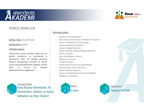 EĞİTİM TÜRÜ: DIŞ EĞİTİMLER - Etkin Zaman Yönetimi İçin Teknikler ve Öneriler
